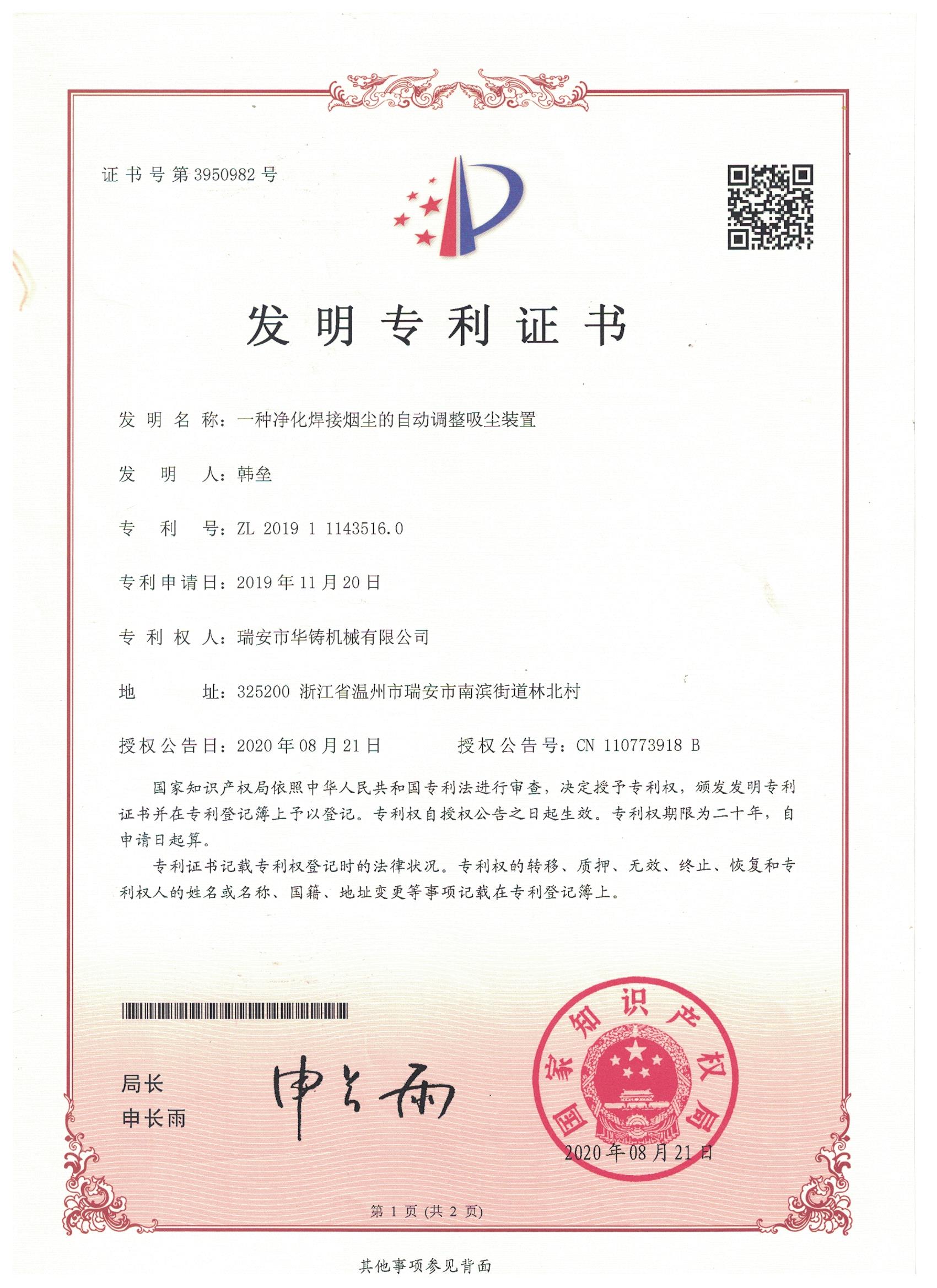 發(fā)明專利證書-一種凈化焊接煙塵的自動(dòng)調(diào)整吸塵裝置